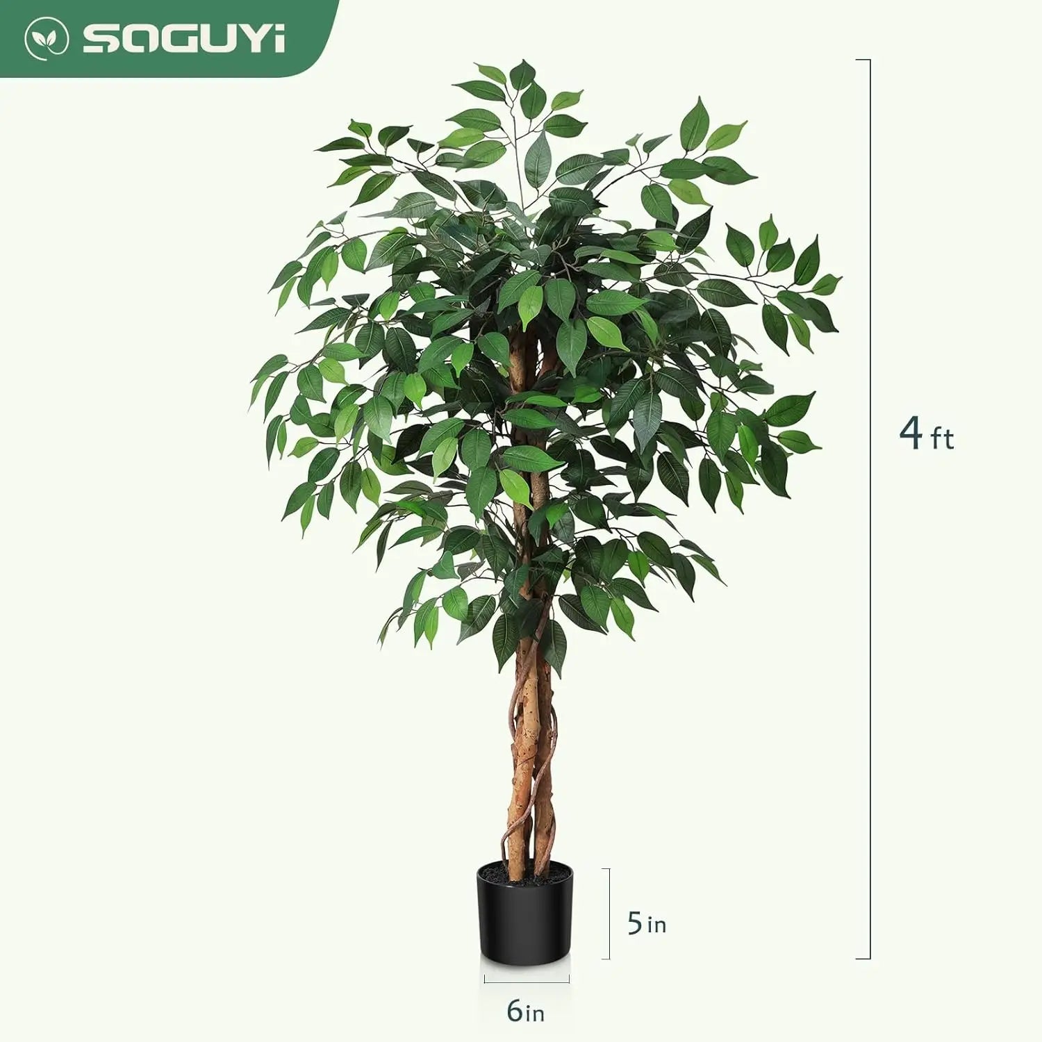 4ft Artificial Ficus Tree with Natural Wood Trunk in Plastic Pot, Silk Fake Plant for Home Office