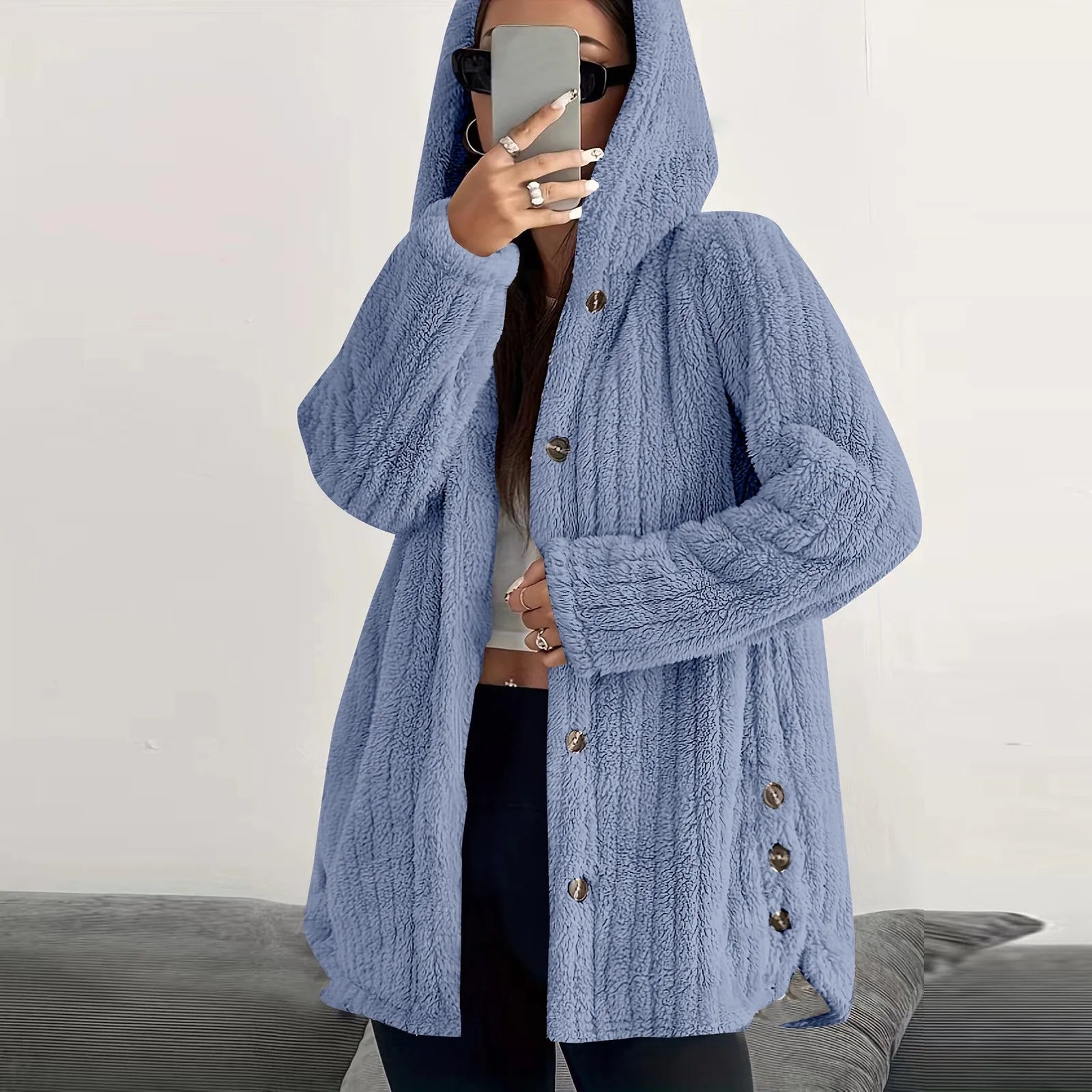 Button Hooded Jacket Plush Top Irregular Trendy Brand Solid Color Jacket For Women
