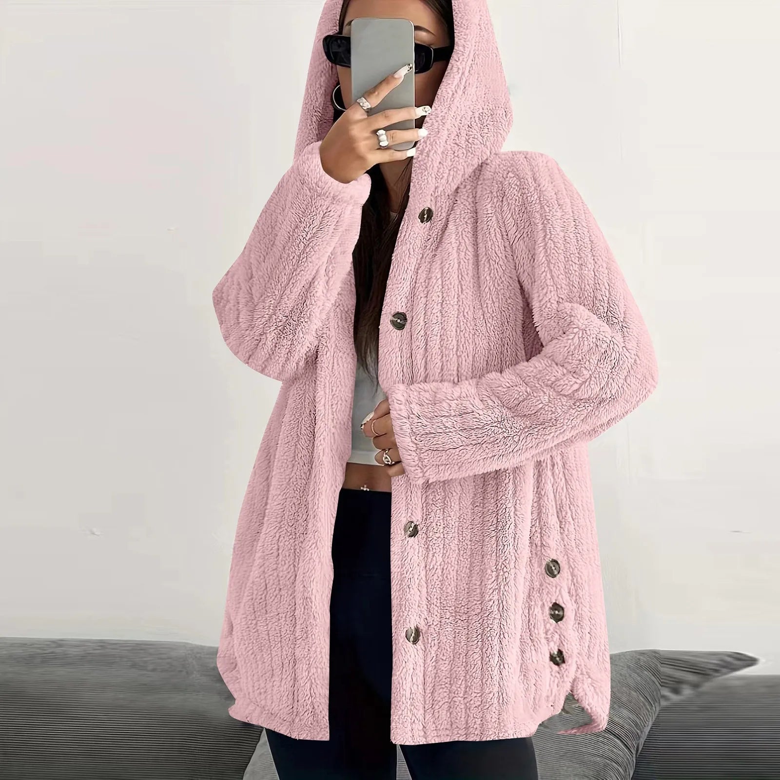 Women's Casual Solid Color Long Sleeve Plush Casual Hooded Button Jacket